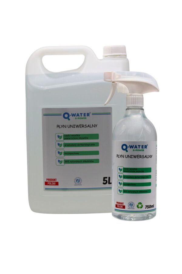 Zestaw płynów uniwersalnych Q-WATER X-POWER 5 L + 750 ml to bezpieczne i wydajne rozwiązanie do czyszczenia wielu powierzchni – idealne do domu, biura i firmy sprzątającej.